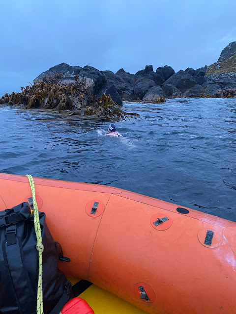 Suddenly the boat was as near to the start as it could get; Mike, Gráinne and I climbed down into the IRB and headed towards appointed rocks. As with the Cook Strait, this was the moment when the adventure became real. After waiting for so long I couldn’t really believe we were about to start, and the enormity of the work ahead seemed vast. The morning light was very blue, the air was very cold, and my towel was very small. However, there was no piercing Antarctic wind, and I couldn’t see any icebergs, just a lot of very large kelp swirling around the rocks. Moreover, there were some happy things to think about: although 1 April may not seem an auspicious day to undertake this ‘adventure swim’ (although, arguably, only a fool would consider it anyway), ! April was also the anniversary of the start of Rebecca’s double Taupō swim and thus (give or take 18 hours) exactly a year since the possibility of my swim had been first discussed. In addition, it was also the anniversary of Gráinne’s Taupō swim on 1 April 2021, and she had been the last person in Foveaux, having completed a successful crossing from Rakiura to the mainland in March 2022. And, as if those three coincidences weren’t enough to motivate me, I knew that Chloe Harris – who’d been the first person to complete this swim in the twenty-first century – had said she was looking forward to seeing us at Christchurch Airport the next morning. I couldn't let any of these people down. With so much good augury in the air – as well as the appearance of an albatross – I really had to get on with it.
